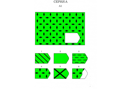Испытуемому предъявляются рисунки с фигурами, связанными между собой определенной зависимостью. Одной фигуры не достает, а внизу она дается среди 6 других фигур. Задача испытуемого - установить закономерность, связывающую между собой фигуры на рисунке, и указать (назвать) номер искомой фигуры из предлагаемых вариантов.