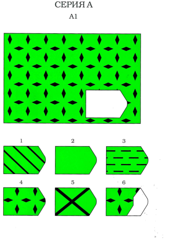 Испытуемому предъявляются рисунки с фигурами, связанными между собой определенной зависимостью. Одной фигуры не достает, а внизу она дается среди 6 других фигур. Задача испытуемого - установить закономерность, связывающую между собой фигуры на рисунке, и указать (назвать) номер искомой фигуры из предлагаемых вариантов.