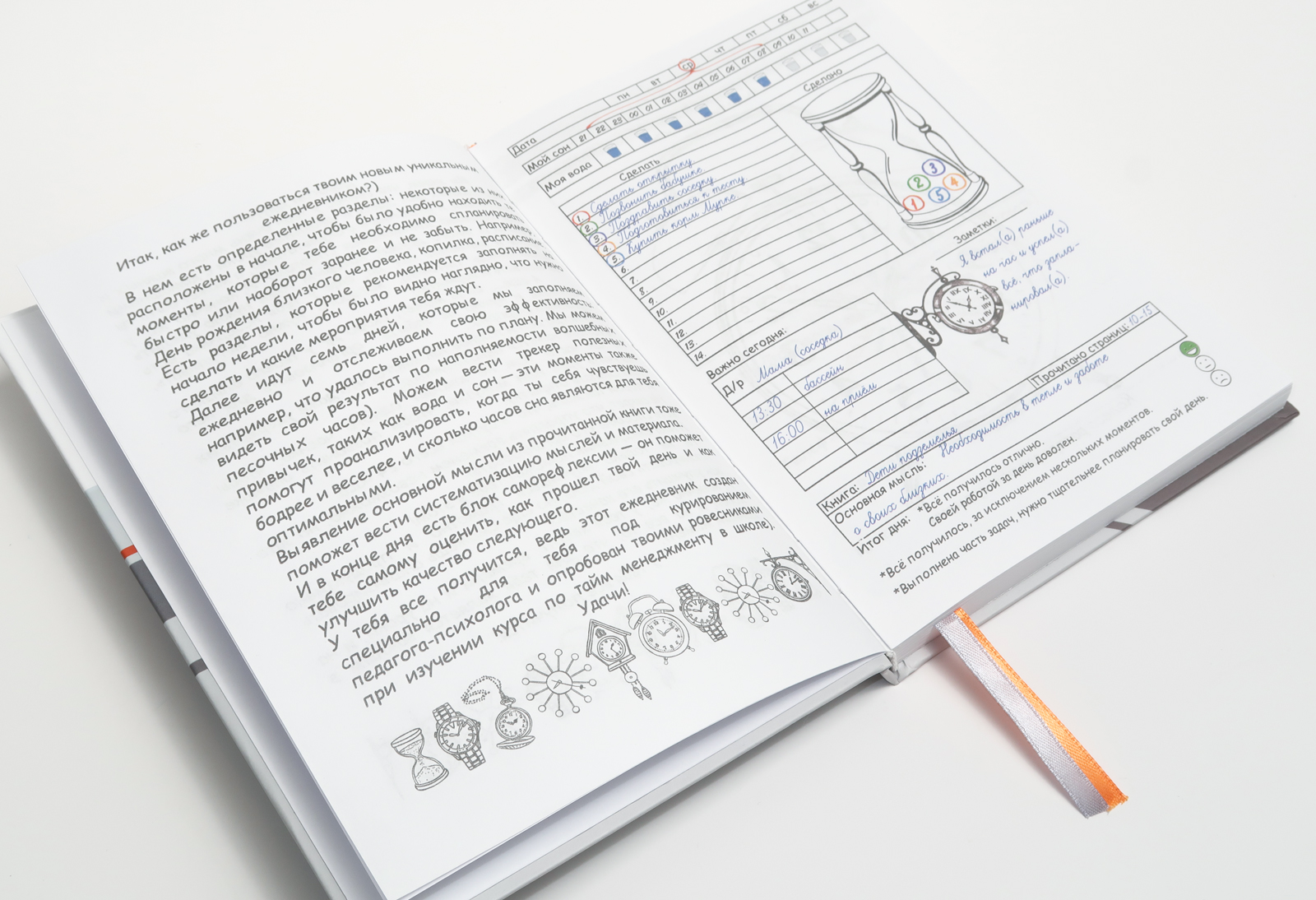 «Teennager clock book» - ежедневник для подростков, который научит грамотно и продуктивно планировать и анализировать свой день. В нем есть несколько разделов: некоторые из них расположены в начале, чтобы было удобно находить те моменты, которые необходимо спланировать быстро или наоборот заранее и не забыть. Например, день рождение близкого человека, копилка, расписание дня. Ежедневник создан педагогом-психологом и успешно опробован подростками при изучении курса по тайм-менеджменту. Позволяет фиксировать многие важные аспекты подростковой жизни: