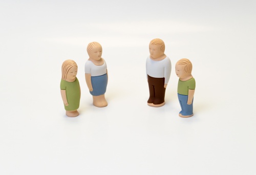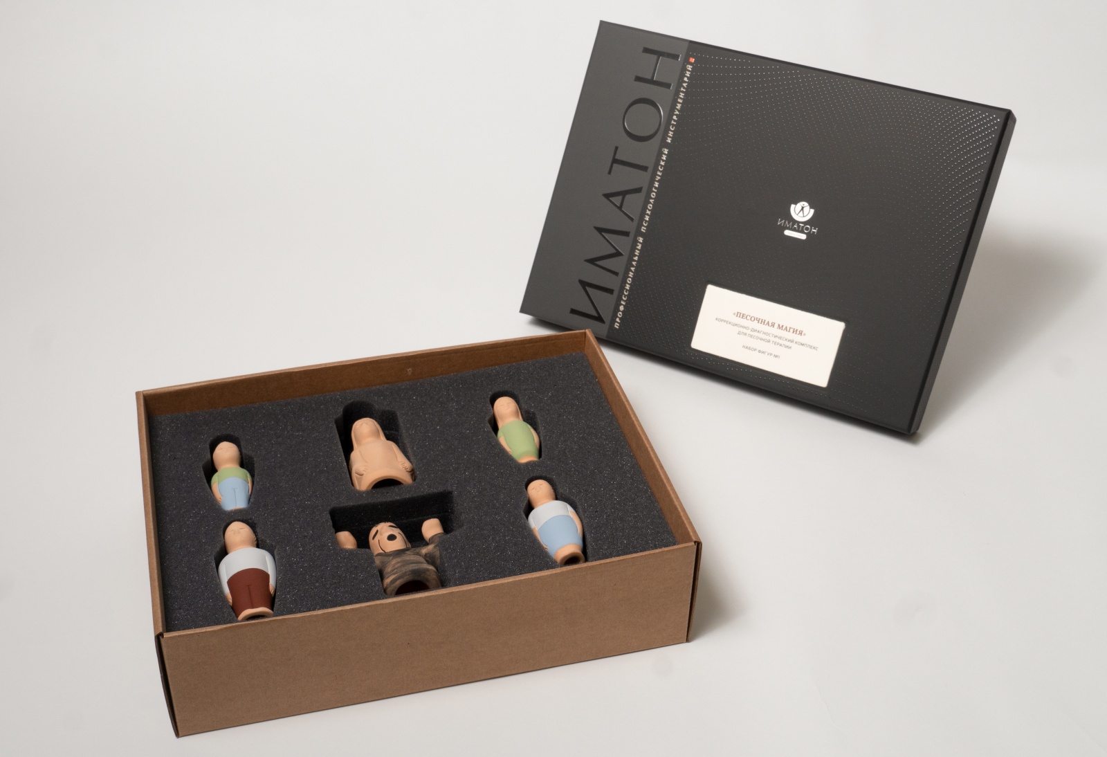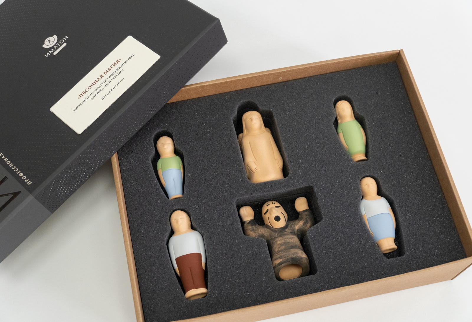 Базовый основной набор фигур для песочной терапии: мужчина, женщина, мальчик, девочка, светлая фигура (добро), фигура в черном (зло).