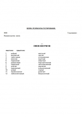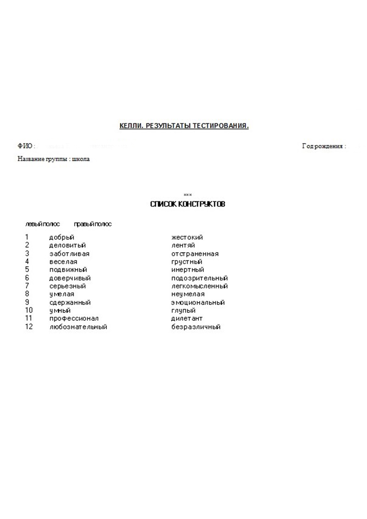 - Выявление конструктов. Конструктом может стать любое слово или словосочетание, имеющее два полюса (хороший-плохой, любит-не любит, открытость-замкнутость и т.д.), которыми испытуемому предлагается описывать свойства и качества заданных персонажей, в формате ответов на несложные вопросы.