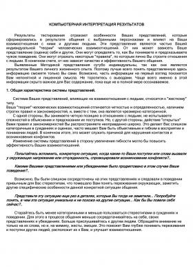 Результаты тестирования отражают особенности представлений испытуемого, которые сформировались в результате общения с выбранными персонажами и влияют на его отношения с ними и другими людьми. Итоги представляются в виде наглядных графиков отношений, таблиц и процентных соотношений значимых корреляций, дополненными комментариями. Тестирование предполагает как компьютерное, так и бланковое проведение. В методическом руководстве представлены теоретические основы, назначение и сферы применения системы, подробно описана процедура психологической диагностики на всех ее этапах и содержание основных психодиагностических данных, конкретные примеры психологического консультирования. Отдельное место в нем занимают главы, посвященные интерпретации тестовых данных в форме развернутого психологического диагноза, психологической коррекции и психотерапии.
