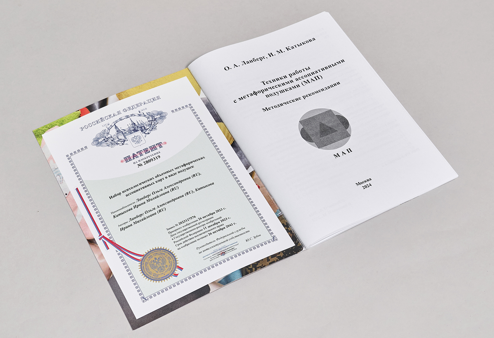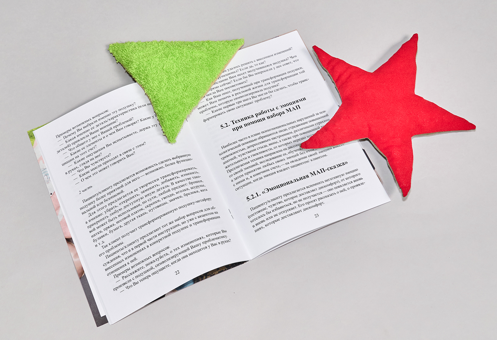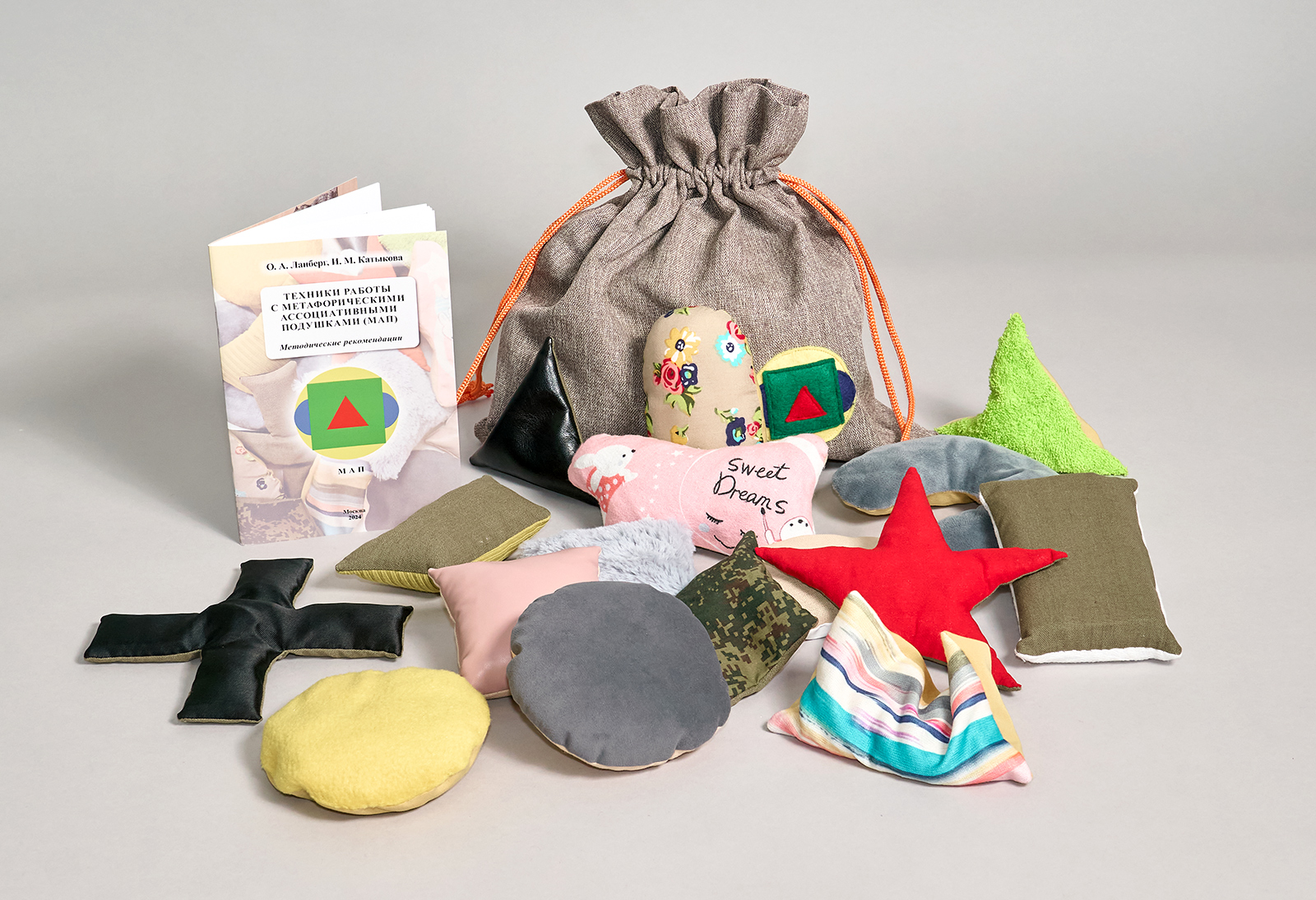 Набор объёмных метафорических карт в виде подушек (МАП) с разнофактурными наволочками, вариативными цветовыми сочетаниями, различными наполнителями и физическими характеристиками (вес, звук, плотность). Одним из принципов работы МАП является мультимодальная сенсорная стимуляция различных каналов восприятия информации, позволяющая использовать широко использовать данный инструмент: