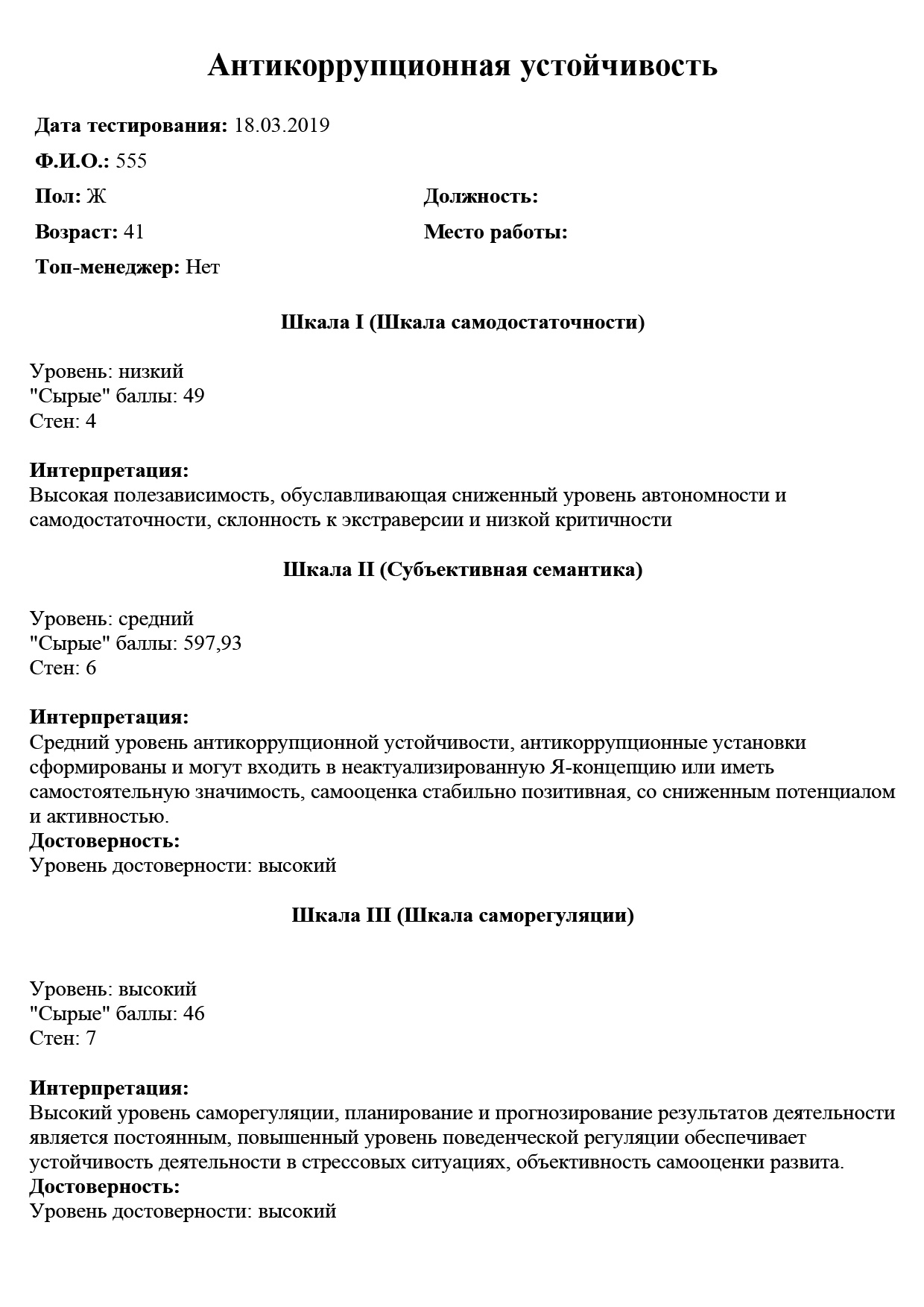 Обработка и интерпретация результатов тестирования полностью сопровождается компьютерной программой, включая окончательное заключение.