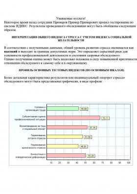 Индивидуальную диагностику можно проводить в бланковом и компьютерном варианте. Стандартное время работы с системой составляет 20-30 минут. По результатам тестирования система выдает пользователю индивидуальный профиль стресса, в котором содержатся сведения об общем уровне стресса и детализированная интерпретация наиболее критичных особенностей его проявлений. Далее, в соответствии с выявленной спецификой синдрома пользователь получает рекомендации оптимизационного характера по устранению негативных последствий стресса. В компьютерной программе заложены три вида уникальных заключений с ограниченным доступом: для клиента, для руководителя и психолога. В методическом руководстве подробно описаны все этапы процедуры тестирования, обработки и интерпретации результатов, приведены развернутые примеры профилей, заключений, описания шкал.
