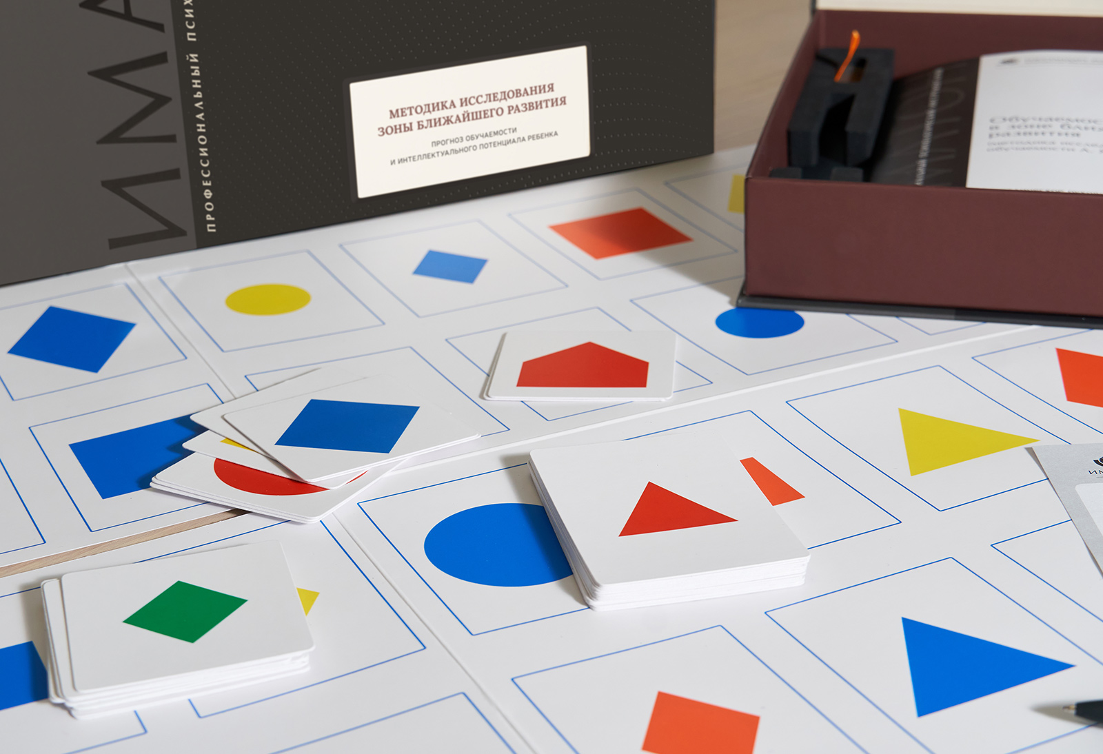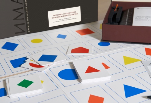 Процедура тестирования включает в себя две группы заданий: основное и аналогичное. Стимульным материалом к каждому заданию служат 24 карточки, на которых изображены геометрические фигуры, отличающиеся по форме (квадраты, круги, ромбы, пятиугольники), цвету (красные, желтые, синие, зеленые) и размеру (большие и маленькие).