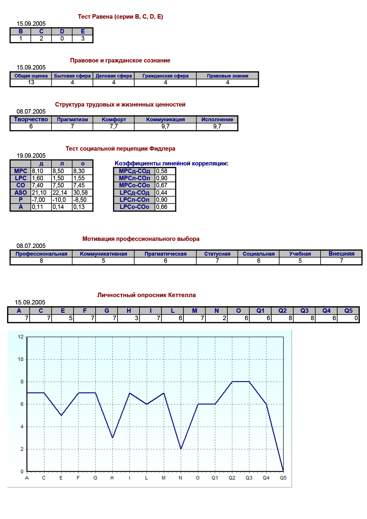 Компьютерная программа предназначена для ввода, хранения и обработки введенных с бланков ответов по методикам: тест структуры интеллекта Амтхауэра, теста Равена (серии B, C, D,E), «Правовое и гражданское сознание», «Структура трудовых и жизненных ценностей», тест социальной перцепции Фидлера, «Мотивация профессионального выбора», личностный опросник Кеттелла.