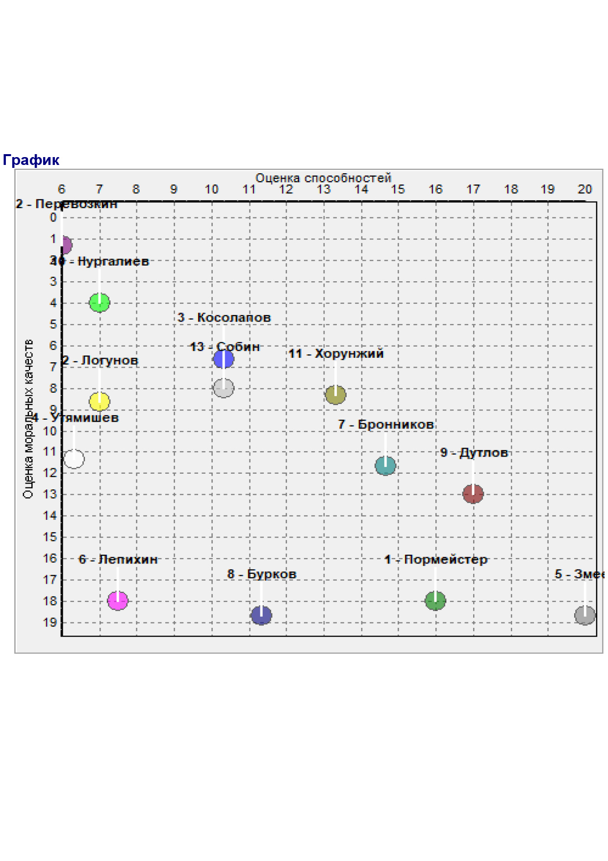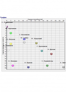 - Графическое отображение номеров членов группы в двухмерном пространстве, образованном осями координат «Способности» и «Моральные качества».