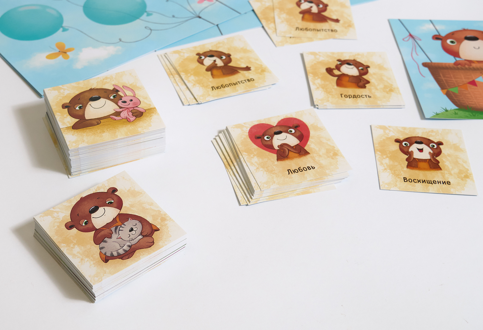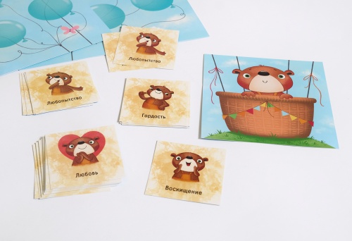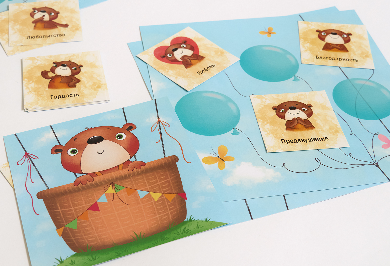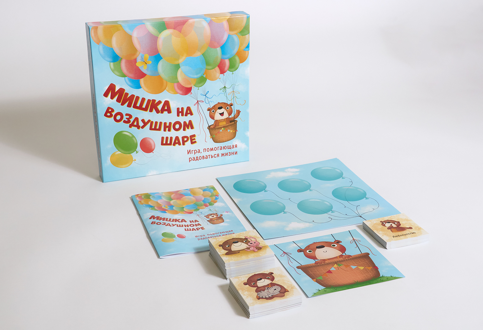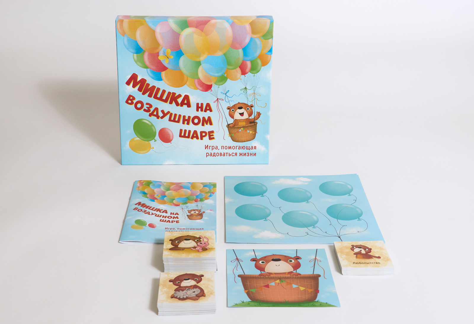 Игра состоит из поля, собираемого из пяти отдельных частей, и карточек, разделенных на категории (положительные чувства, приятные ситуации, возможные реакции в этих ситуациях). На поле изображены воздушные шарики, привязанные к корзинке, в которой сидит маленький Мишка. Задача игроков — закрыть шарики подходящими карточками в зависимости от того, что Мишка чувствует в разных ситуациях, как он себя ведет и в каких еще случаях он может почувствовать себя схожим образом. В игре можно поговорить с ребенком о нюансах положительных эмоций, о том, как они возникают, чем похожи и чем различаются, как влияют на наше самочувствие и состояние.