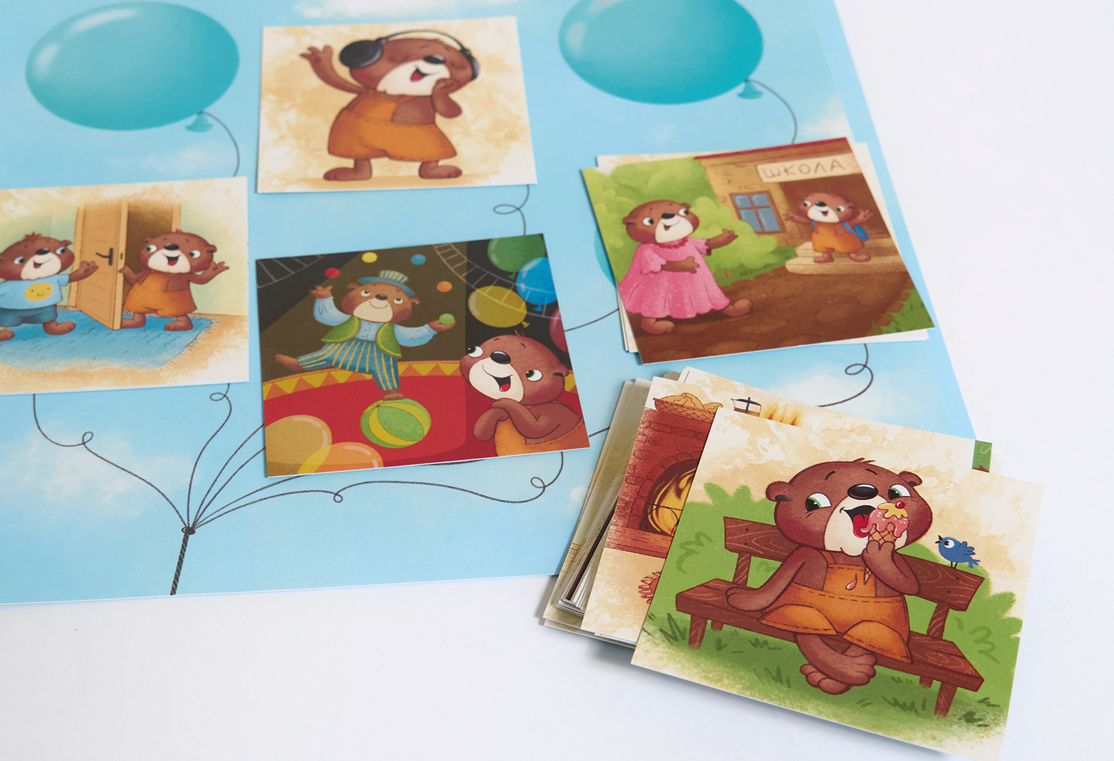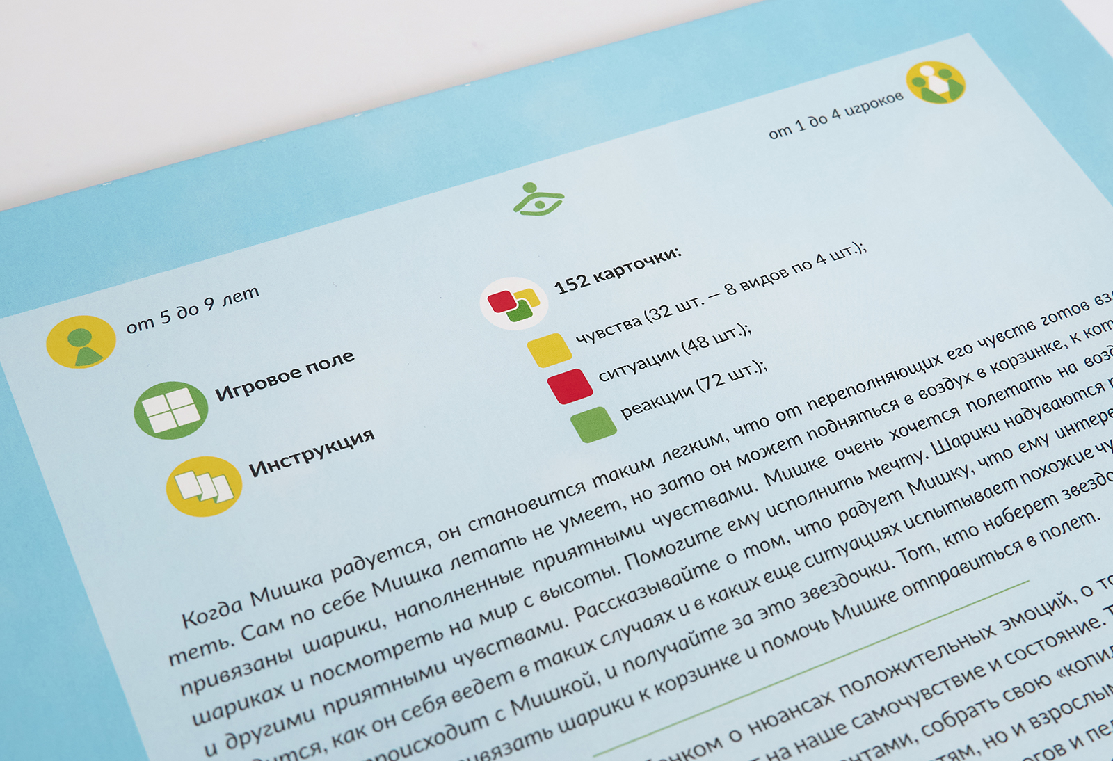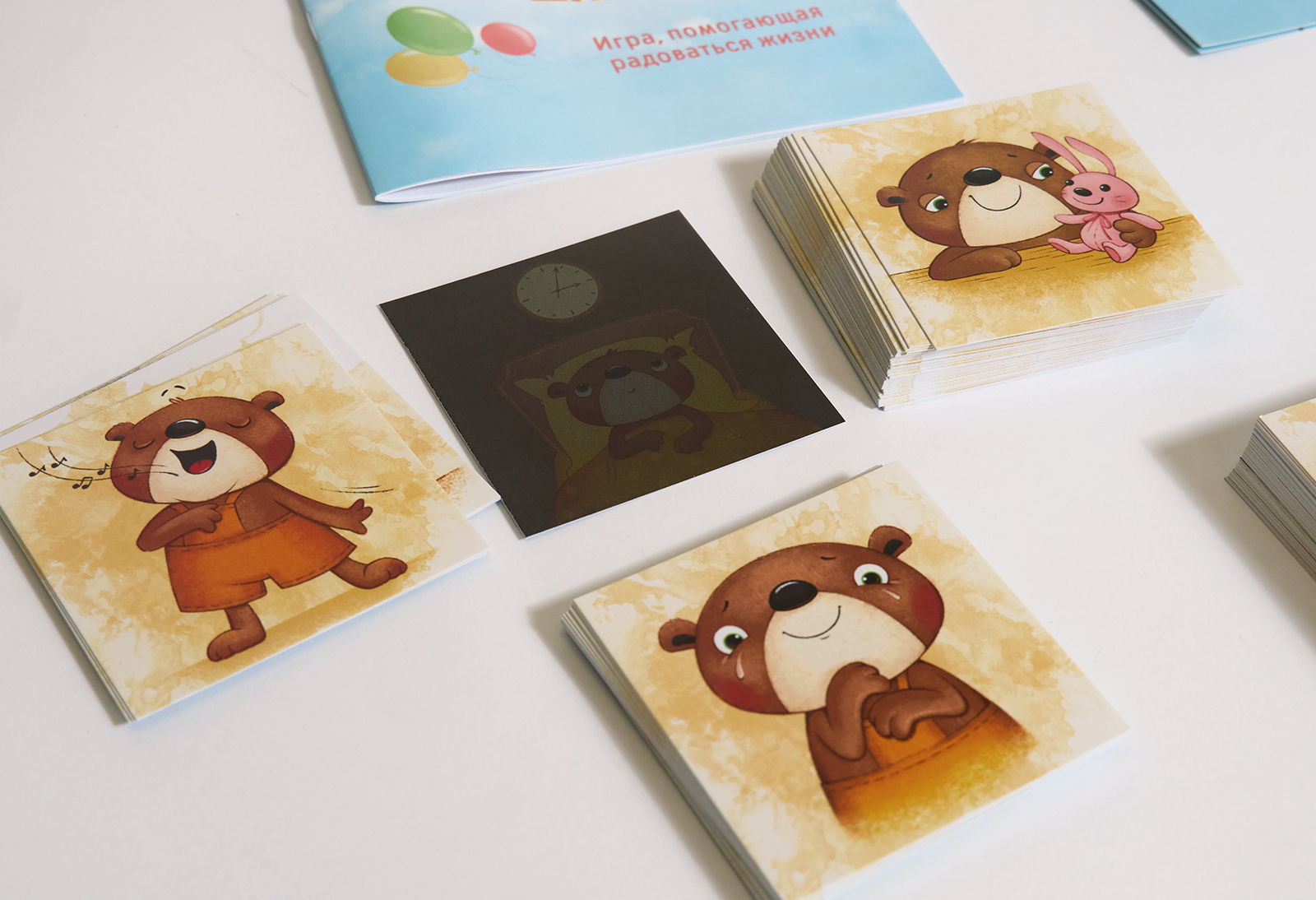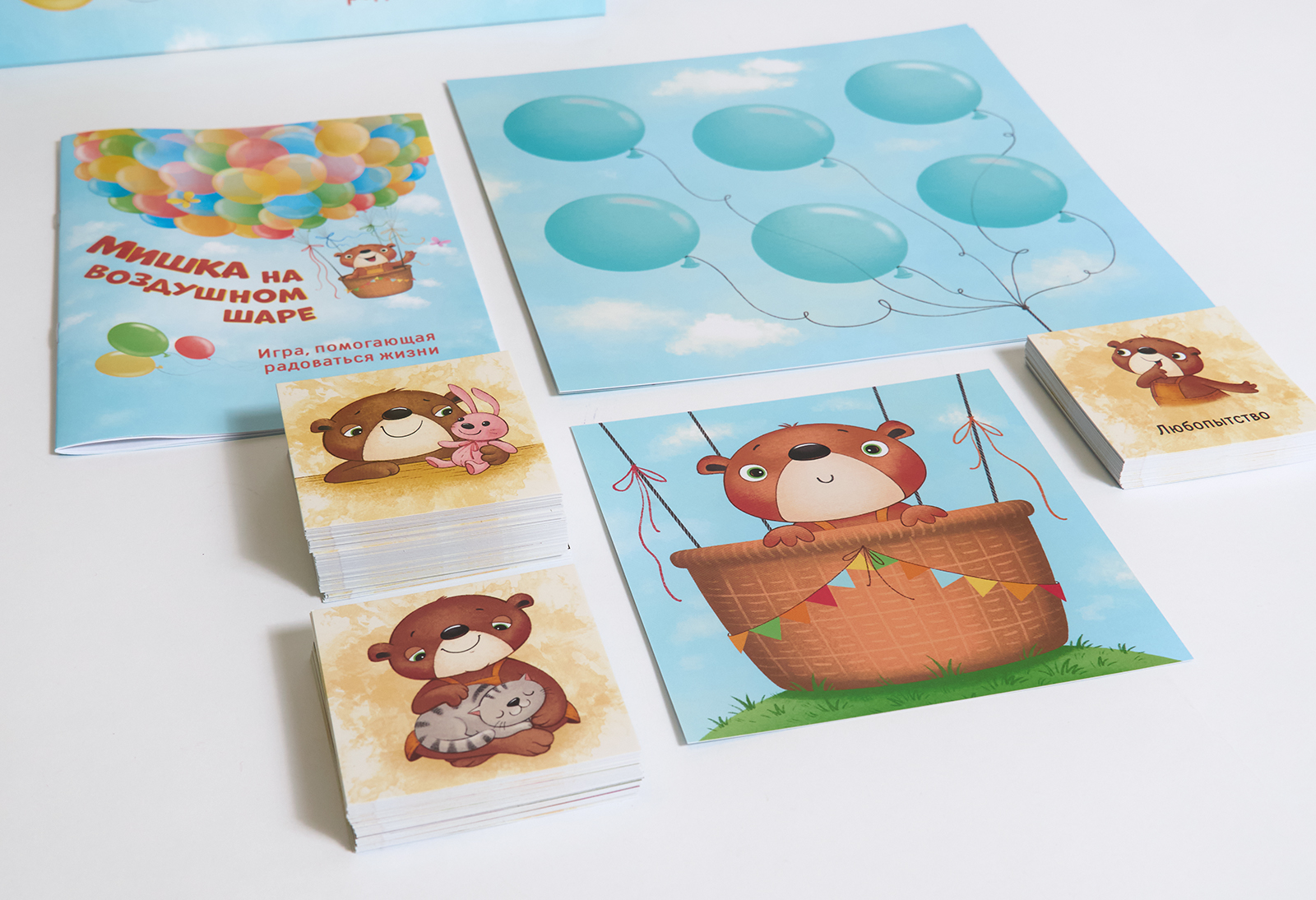 Игра состоит из поля, собираемого из пяти отдельных частей, и карточек, разделенных на категории (положительные чувства, приятные ситуации, возможные реакции в этих ситуациях). На поле изображены воздушные шарики, привязанные к корзинке, в которой сидит маленький Мишка. Задача игроков — закрыть шарики подходящими карточками в зависимости от того, что Мишка чувствует в разных ситуациях, как он себя ведет и в каких еще случаях он может почувствовать себя схожим образом. В игре можно поговорить с ребенком о нюансах положительных эмоций, о том, как они возникают, чем похожи и чем различаются, как влияют на наше самочувствие и состояние.