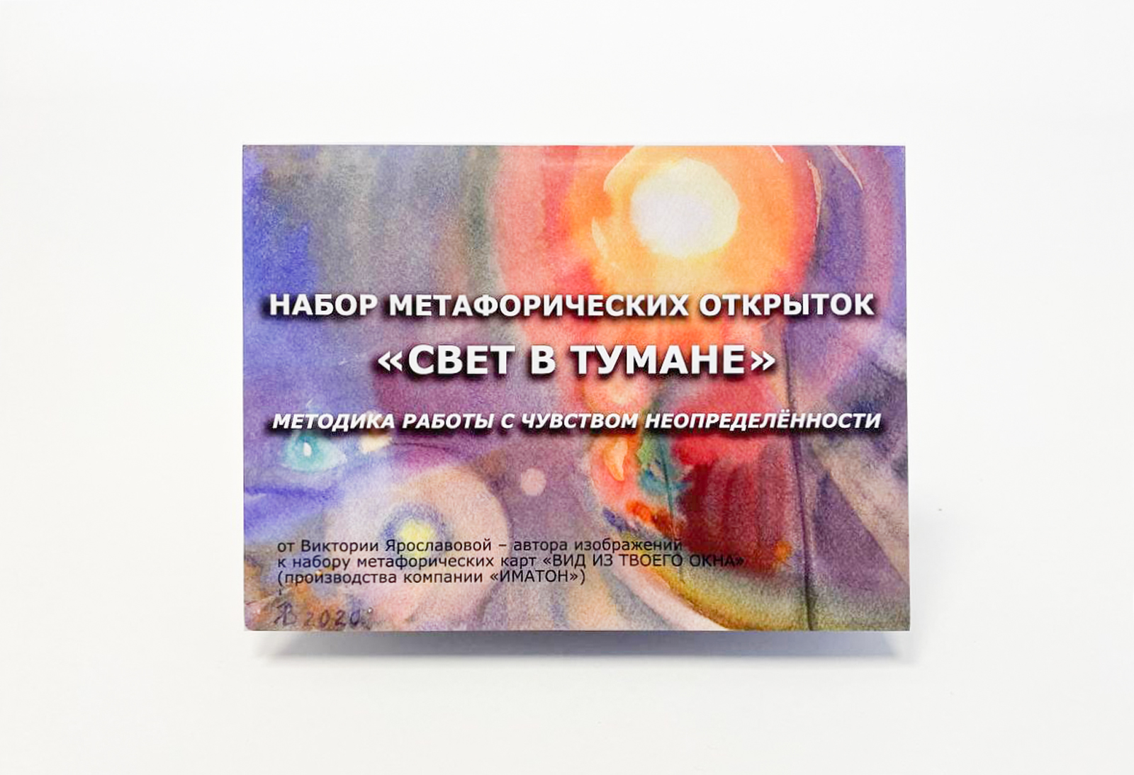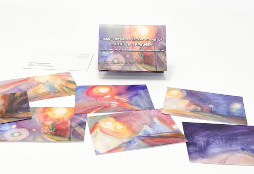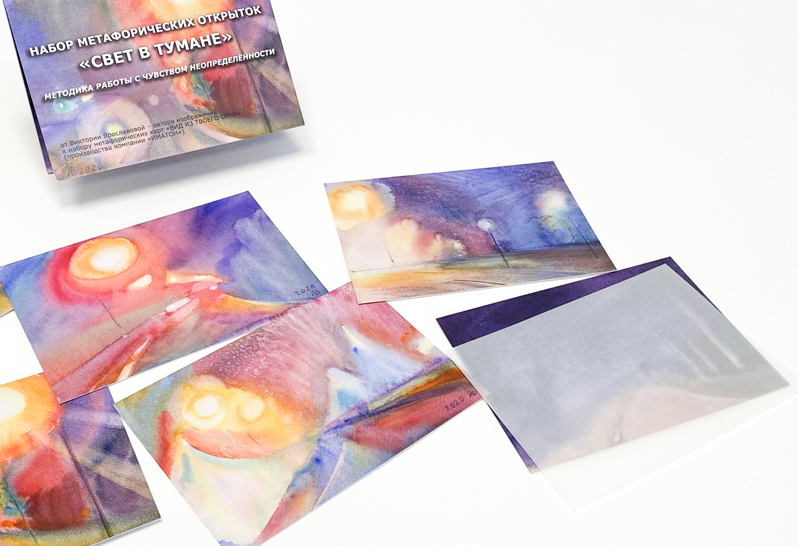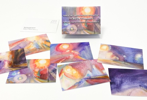 «Серия акварелей «Свет в тумане» родилась в процессе переживания мною личного кризиса в период пандемии. Состояние «тумана», когда то, что впереди не проявлено, знакомо каждому из нас. Неопределенность - это данность жизни, к которой приходится приспосабливаться. И я, рисуя серию работ со светящимися в тумане огнями, нащупывала внутри надежду на лучшее, искала опорные точки, и, в конечном итоге, попала в состояние «здесь и сейчас». В данном наборе открыток я предлагаю алгоритм, позволяющий исследовать и трансформировать чувство неопределенности клиента через арт-терапевтическую практику».