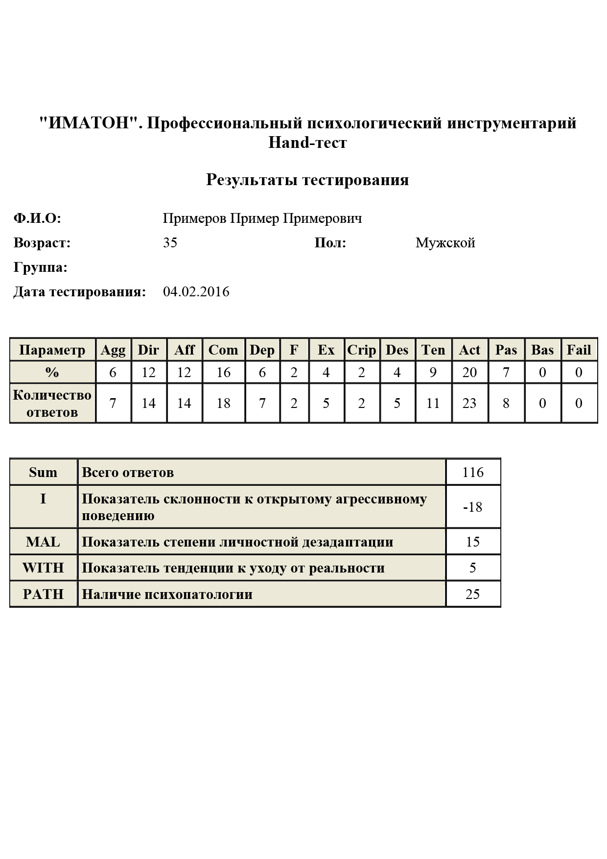 «Hand-тест» выгодно отличается от наиболее известных проективных методик относительной простотой, кроме того, он занимает лидирующую позицию по возможности прогнозировать реальное поведение человека. Стимульный материал состоит из девяти карточек с изображениями кистей рук в различных положениях и одной пустой карточки. Испытуемому предлагается ответить на вопрос о том, что именно делает рука, изображенная на карточке. В случае с пустой карточкой – испытуемому предлагается сначала представить руку в определенном положении, а потом рассказать об этом.