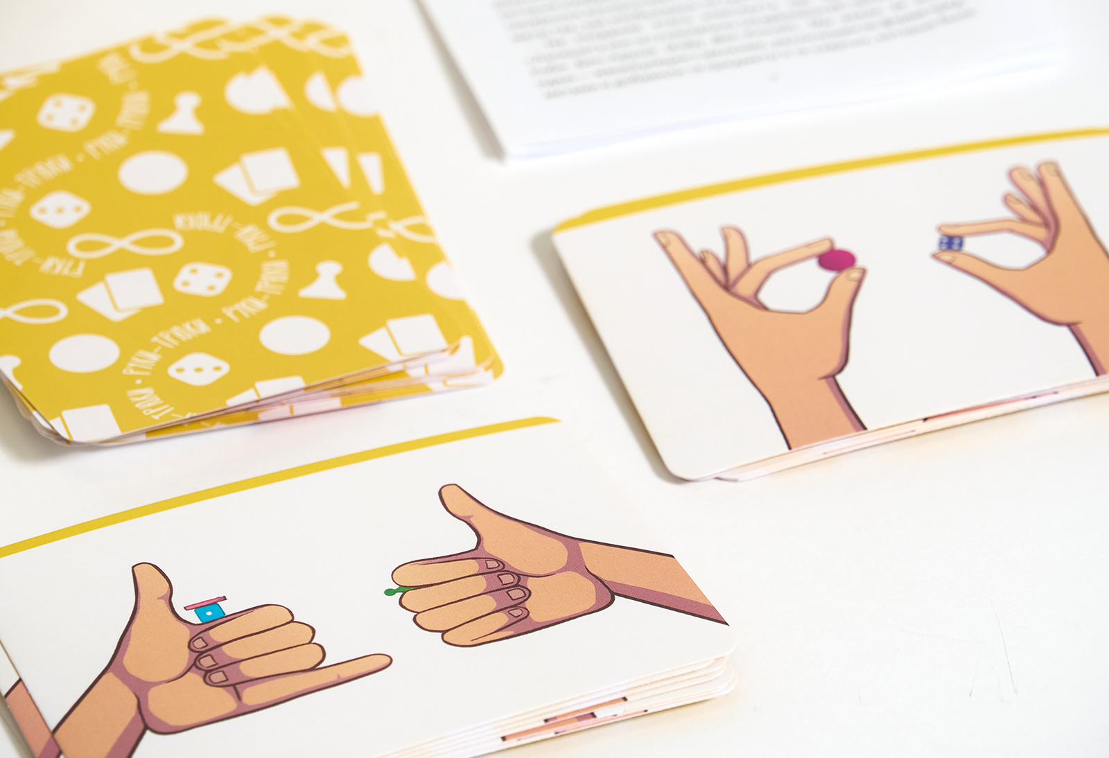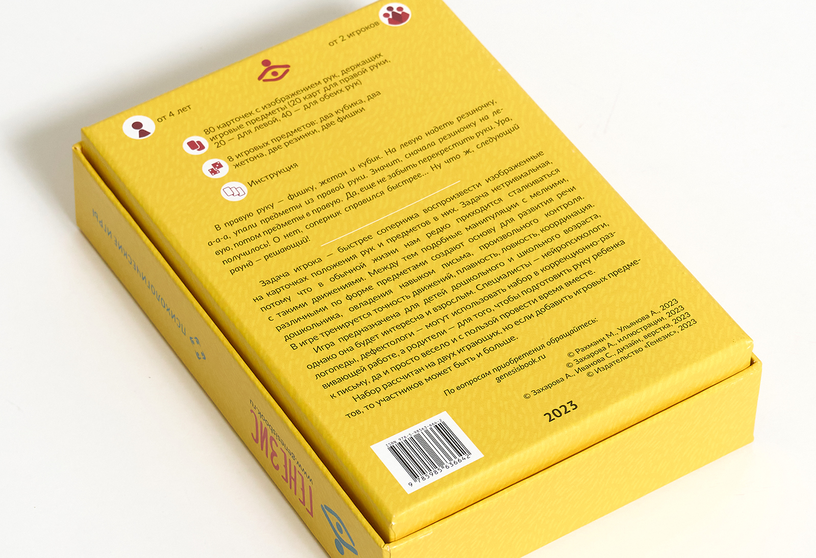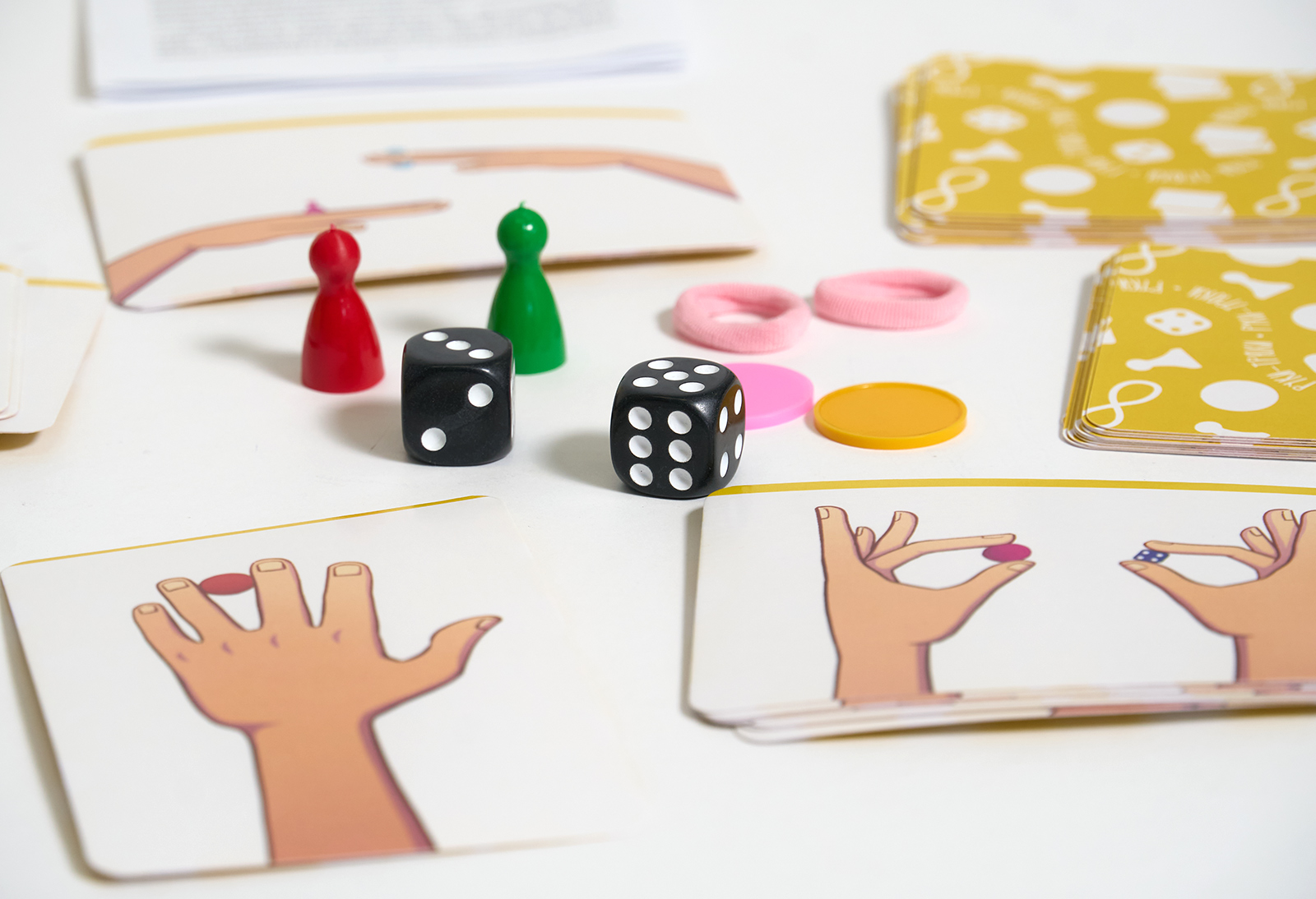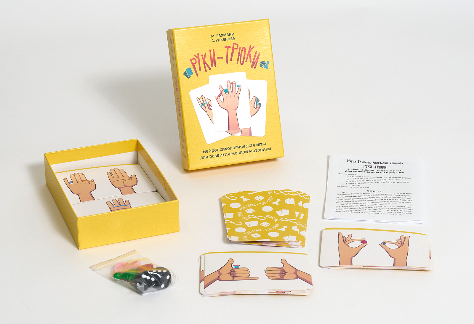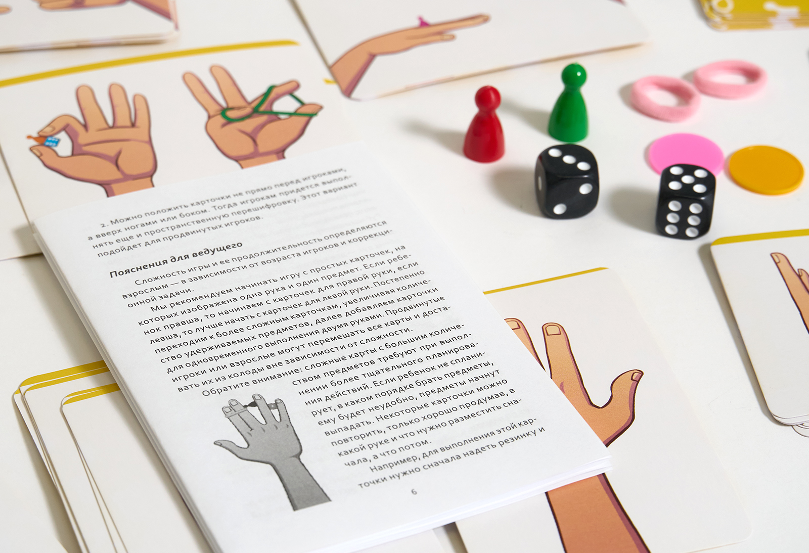 Задача игрока - быстрее соперника воспроизвести изображенные на карточках положения рук и предметов в них. Задача нетривиальная, потому что в обычной жизни нам редко приходится сталкиваться с такими движениями. Между тем подобные манипуляции с мелкими, различными по форме предметами создают основу для развития речи дошкольника, овладения навыком письма, произвольного контроля. В игре тренируется точность движений, плавность, ловкость, координация. Игра предназначена для детей дошкольного и школьного возраста, однако она будет интересна и взрослым. Специалисты - нейропсихологи, логопеды, дефектологи - могут использовать набор в коррекционно-развивающей работе, а родители - для того, чтобы подготовить руку ребенка к письму, да и просто весело и с пользой провести время вместе. Набор рассчитан на двух играющих, но если добавить игровых предметов, то участников может быть и больше.