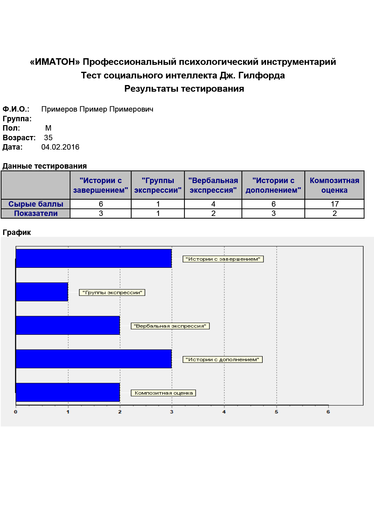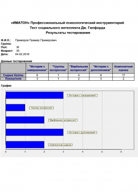 - «Вербальная экспрессия»: измеряет фактор познания преобразований поведения, а именно, способность понимать изменение значения сходных вербальных реакций человека в зависимости от контекста вызвавшей их ситуации. То есть, степень чувствительности к характеру и оттенкам человеческих взаимоотношений, понимания того, что люди говорят друг другу (речевой экспрессии) в контексте определенной ситуации, определенных взаимоотношений.