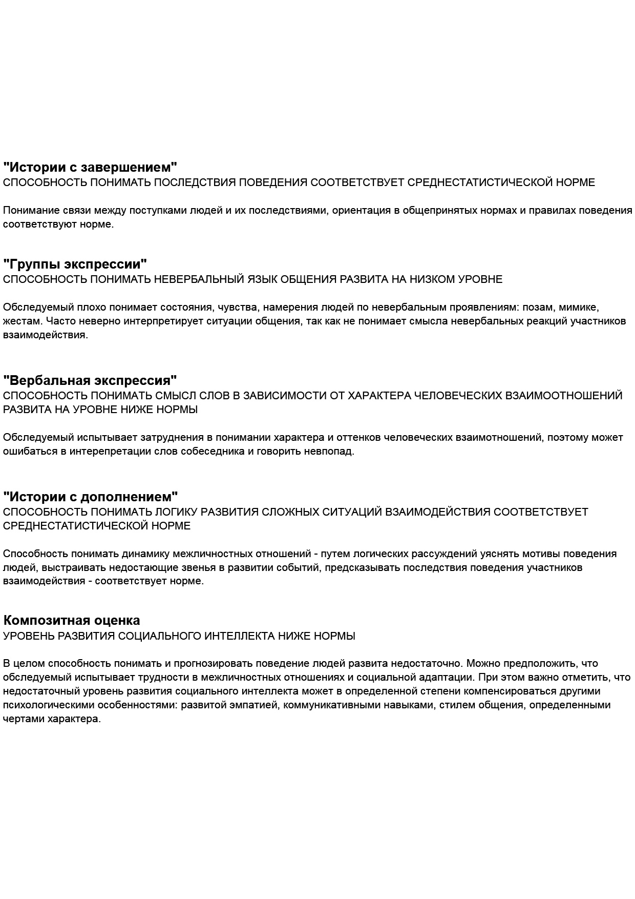 - «Истории с завершением»: измеряет фактор познания результатов поведения, то есть способность понимать связь между поведением и его последствиями, способность предвосхищать дальнейшие поступки людей на основе анализа реальных ситуаций общения (семейного, делового, дружеского), предсказывать события, основываясь на понимании чувств, мыслей, намерений участников коммуникации.