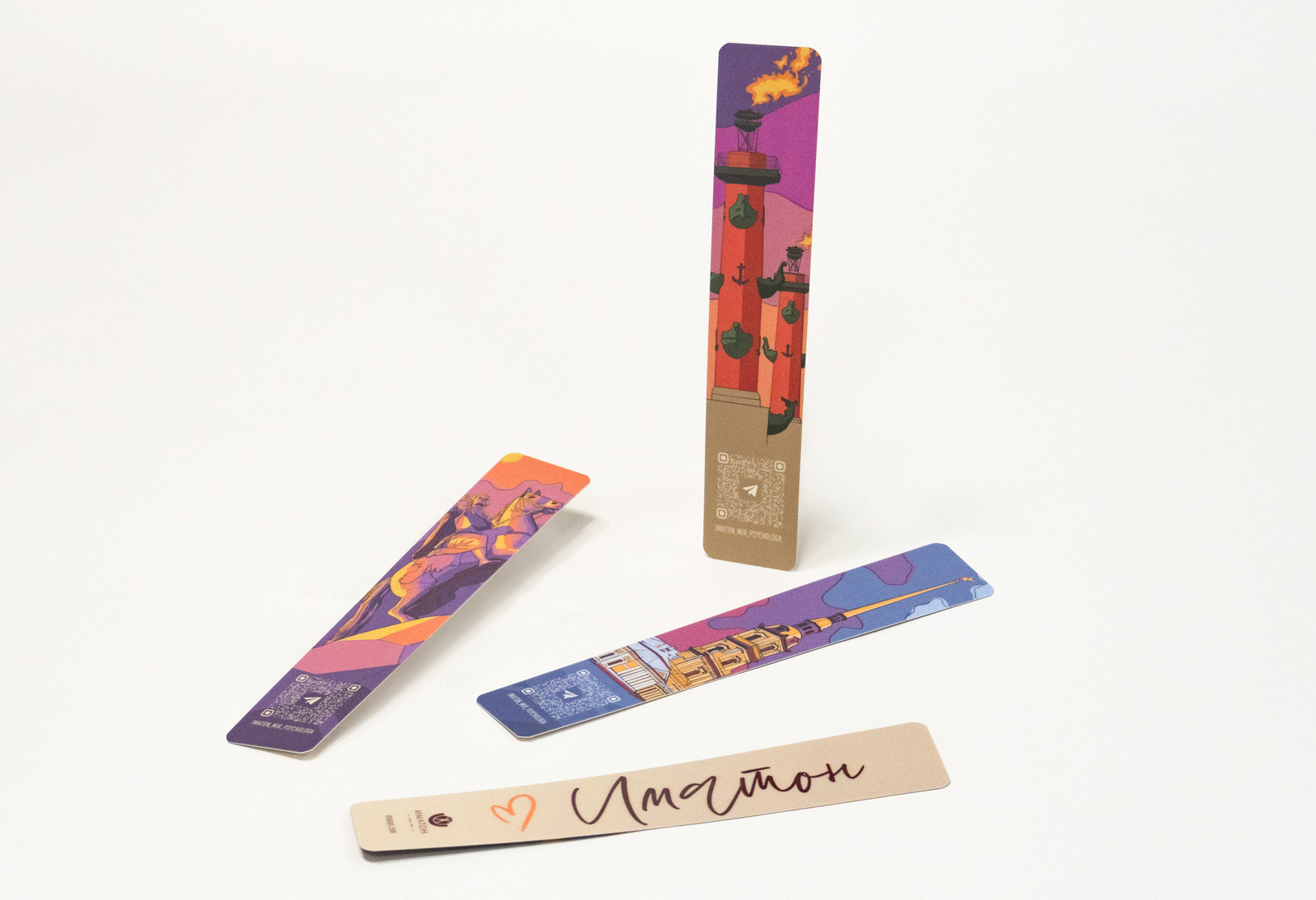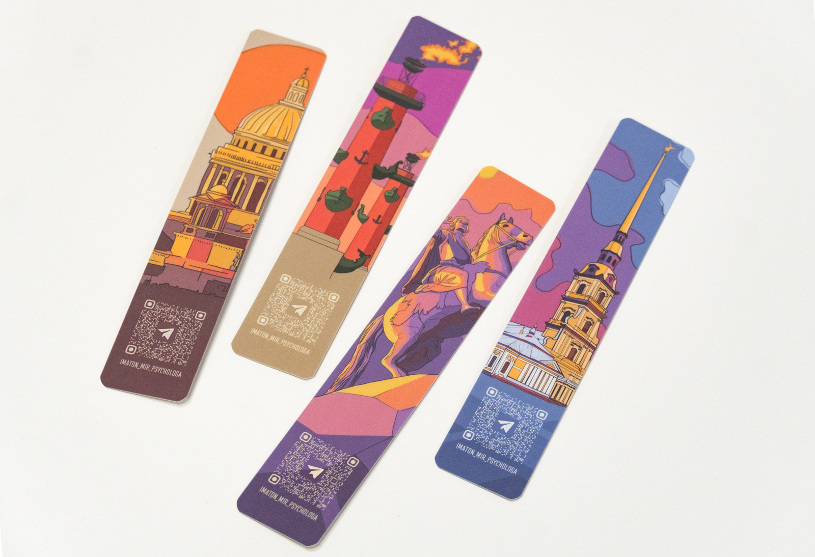 Набор из 4-х закладок с авторскими рисунками, созданный специально, чтобы читатель не потерял в книге самое важное. Сделано с любовью к городу и психологической науке.