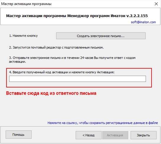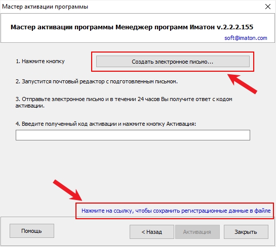В случае отсутствия почтового клиента Microsoft Outlook, нажмите на ссылку внизу окна для сохранения регистрационных данных. Сохраненный файл прикрепите к письму и отправьте на адрес soft@imaton.com