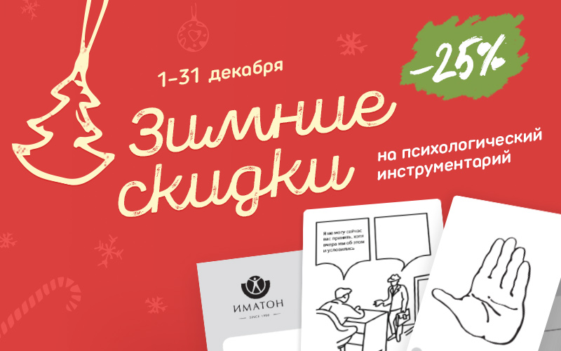 Декабрь – пора новогоднего настроения, мерцающих огоньков и хвойных ароматов, а также традиционный месяц подведения итогов текущего года и разработки планов на следующий. Идеальное время следовать за вдохновением и ставить смелые профессиональные цели в преддверии Нового года! Компания «Иматон» объявляет месяц эксклюзивных скидок на базовые комплекты методик – профессиональные психодиагностические инструменты с ручной обработкой данных. Полные версии методик, включающие компьютерную обработку результатов тестирования, Вы также всегда найдете в нашем каталоге.