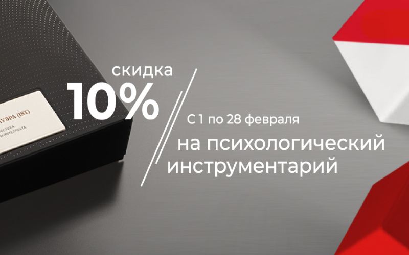 В честь этого события мы дарим скидку 10% на все тесты и методики Компании «Иматон»! Акция действует с 1 по 28 февраля 2021 года на покупки через интернет-магазин и в фирменном магазине Компании «Иматон». Скидка не распространяется на Оригинальный тест Люшера и дополнительные комплекты стимульных материалов. Цены на сайте указаны с учетом скидки.Пусть результаты работы неизменно приносят радость, а новые цели вдохновляют на профессиональные решения!
