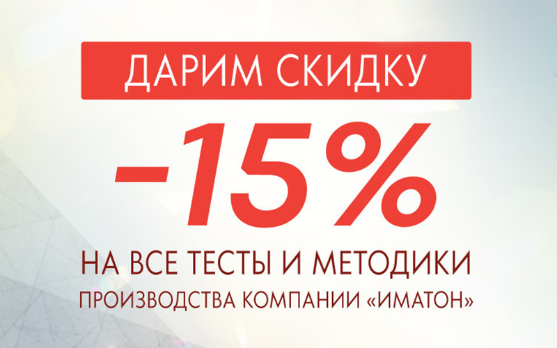 30 января 2020Дарим скидку 15%!Дорогие друзья, в связи с 30-летием Компании «Иматон» мы дарим скидку 15% на все тесты и методики нашего производства!